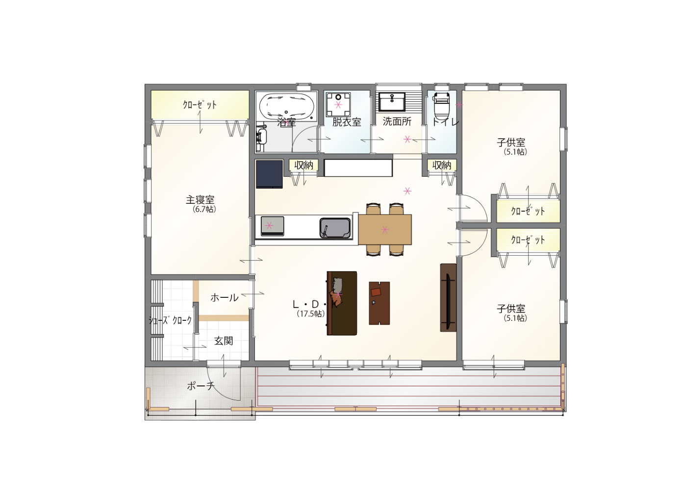 主寝室と二つの子供室を備えた3LDKの平屋は、家族の距離を近くに感じながら、それぞれの居場所もきちんと守ってくれる。