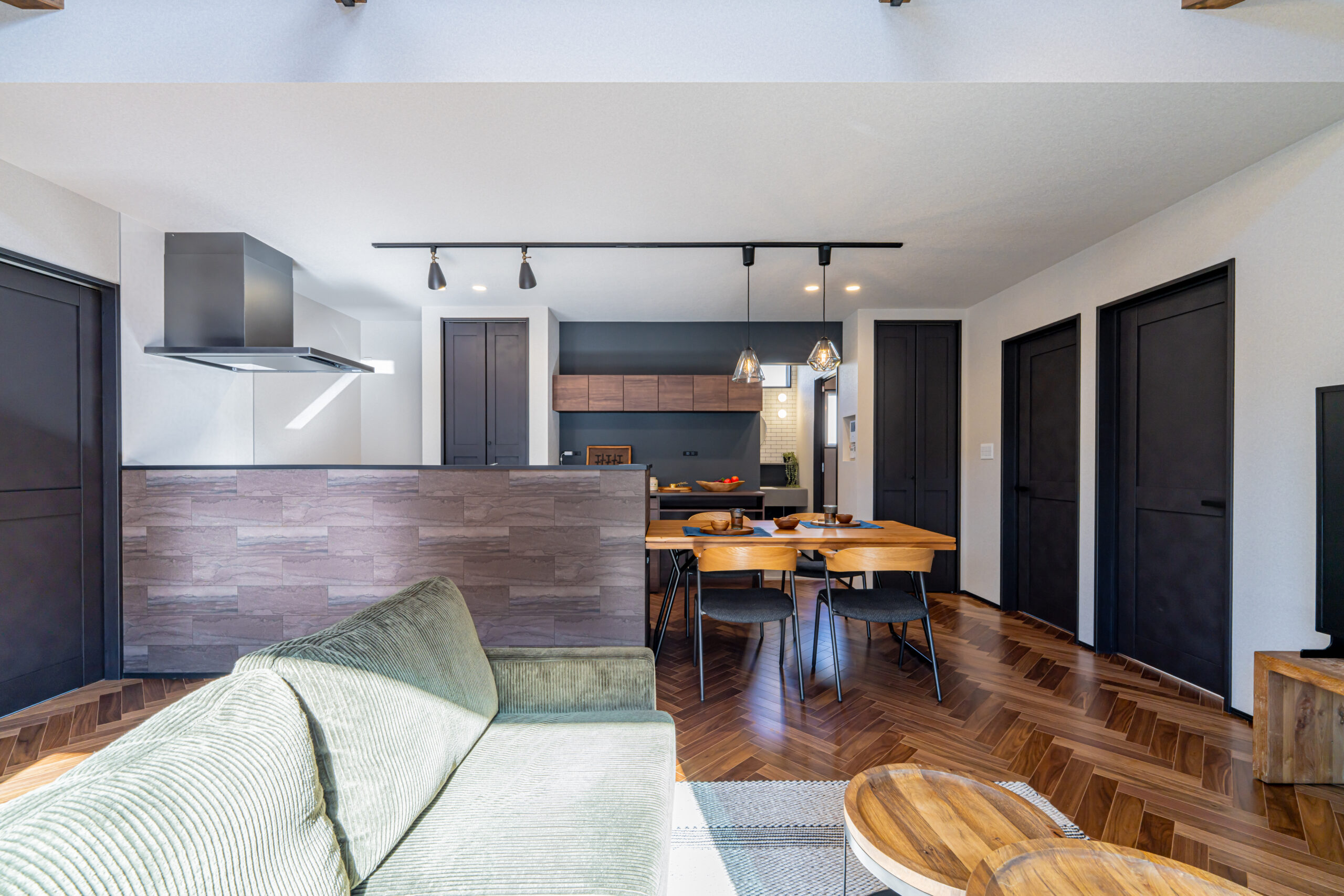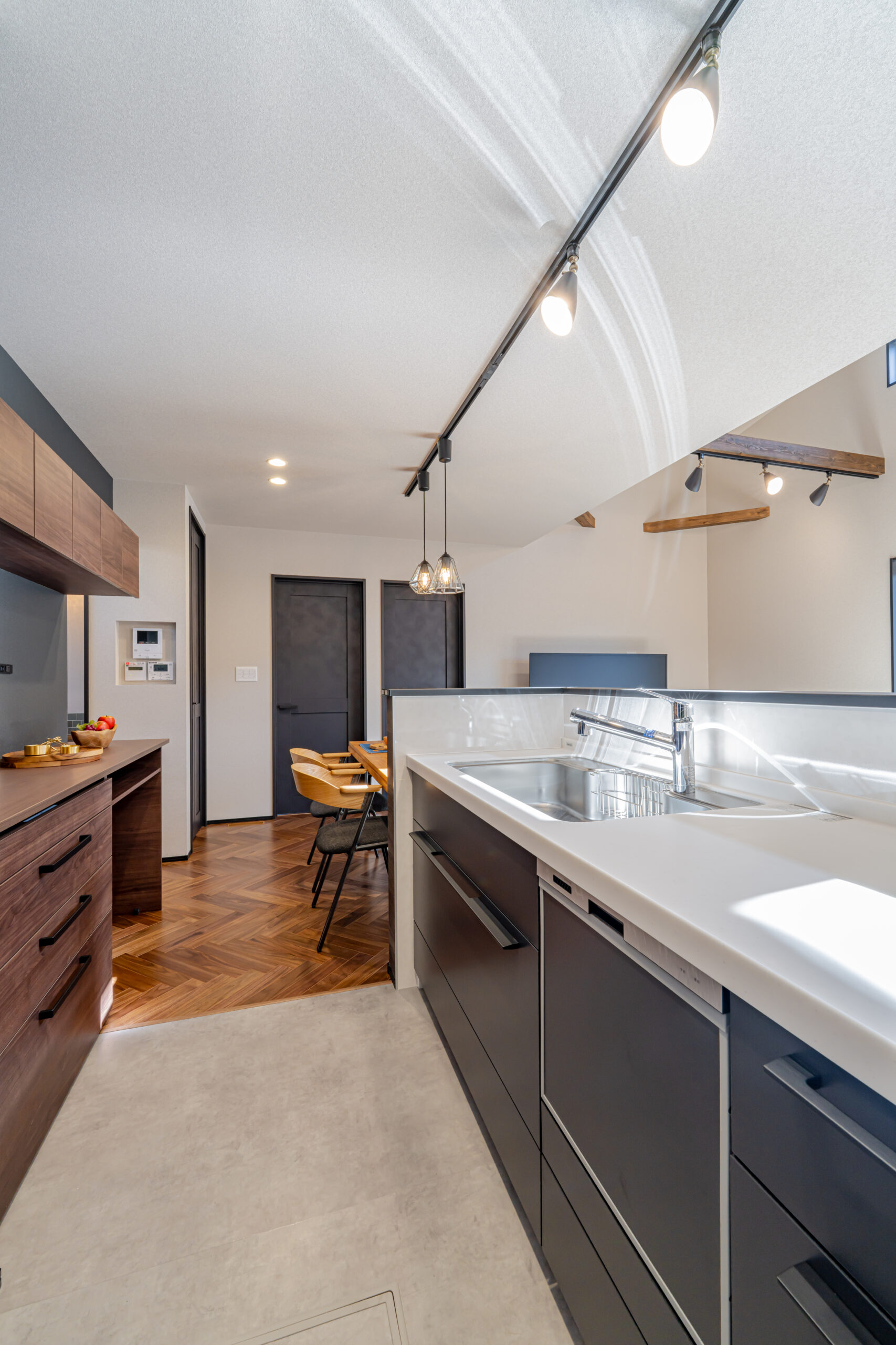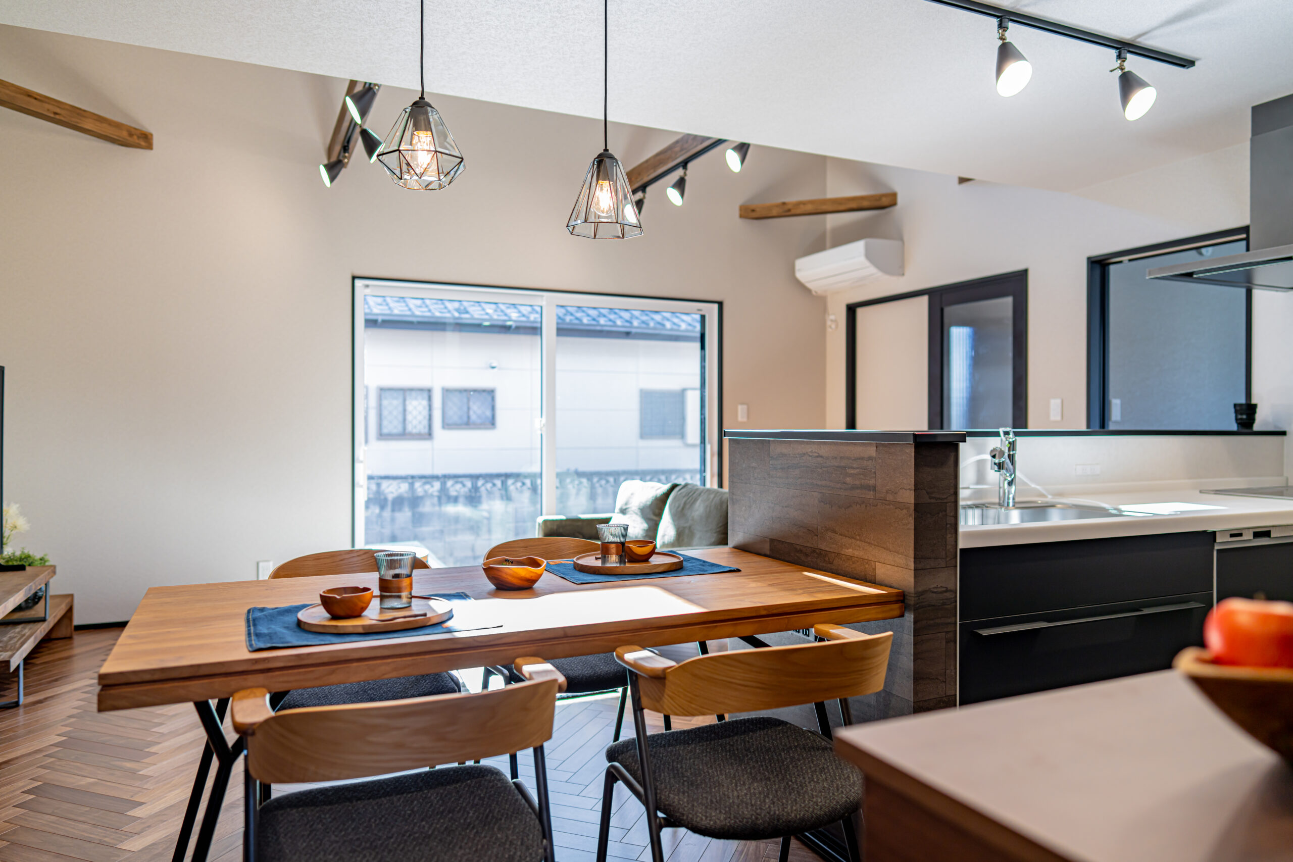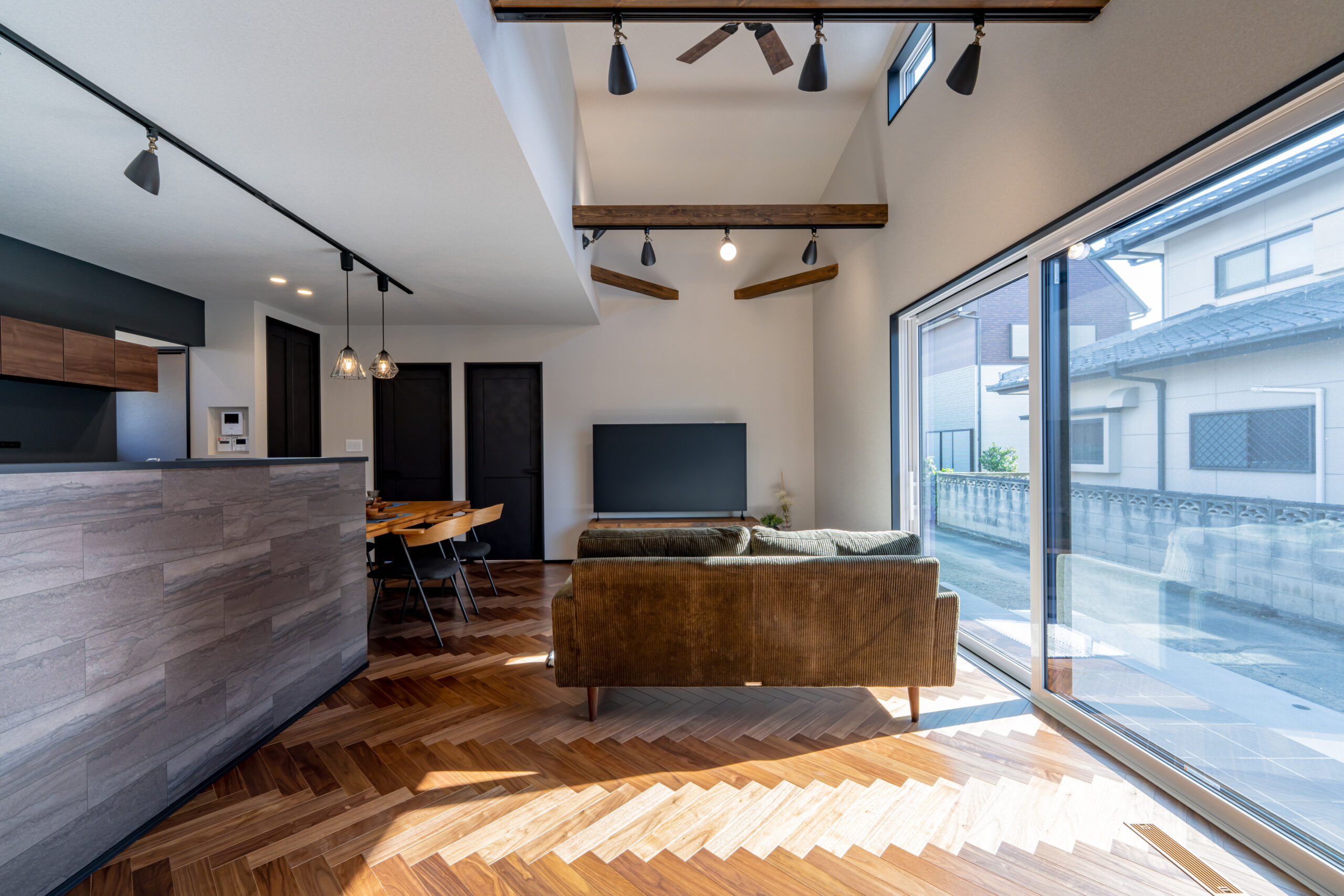 大きな開口から光を招き入れながら、落ち着いた色味のキッチンや建具、床の表情が空間全体を引き締める。