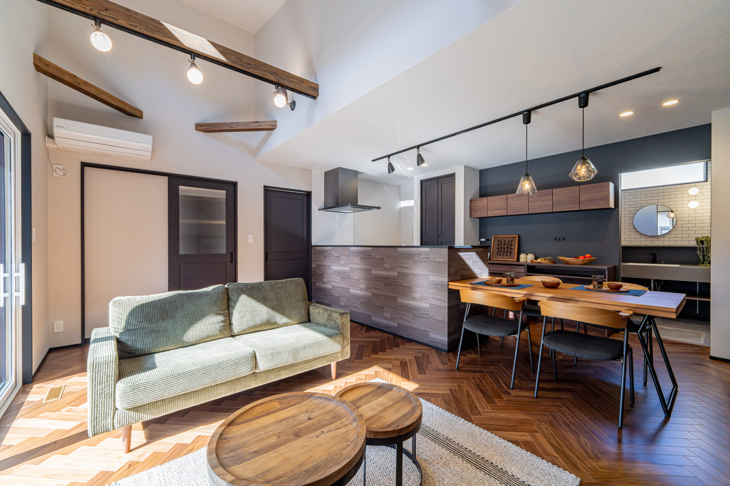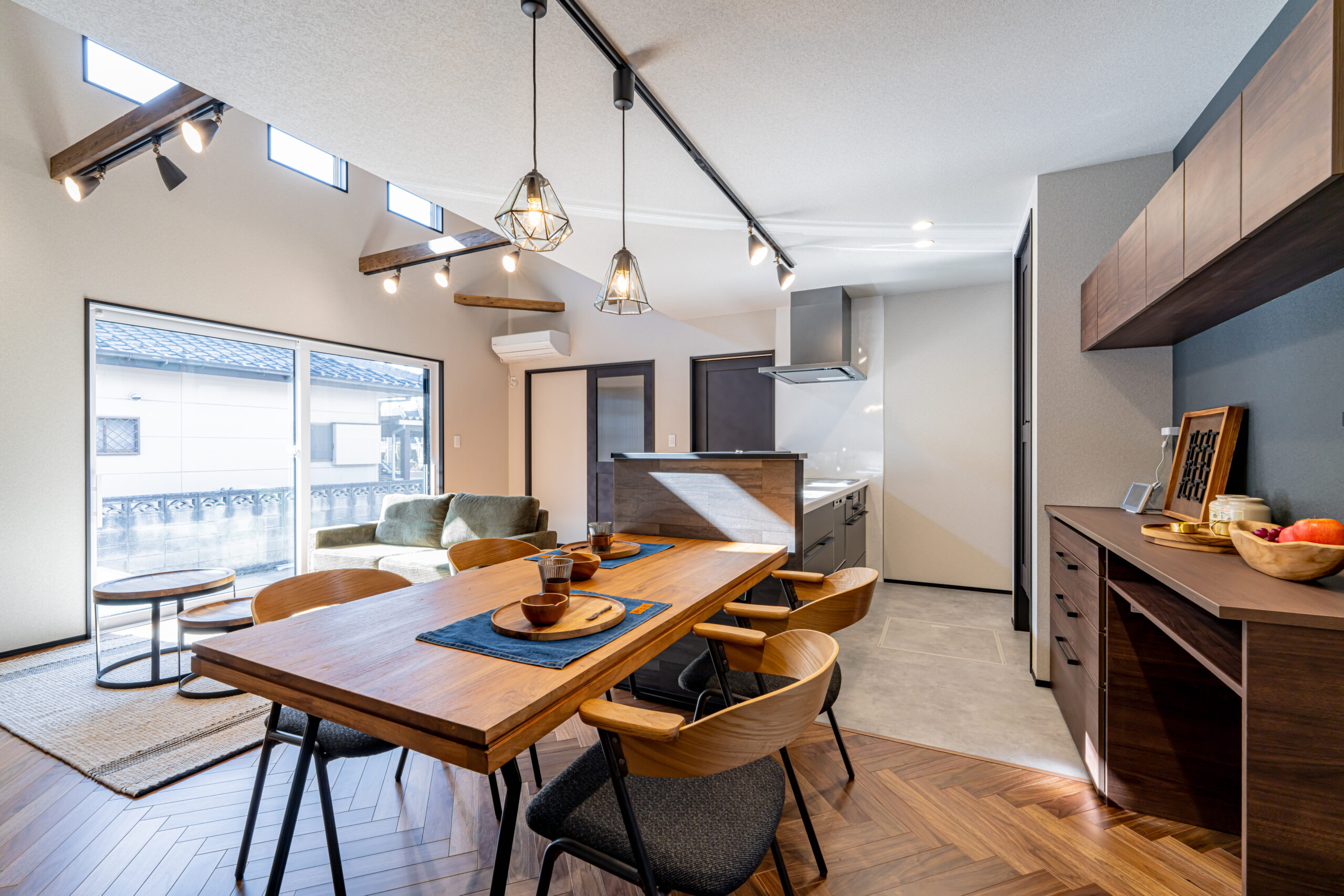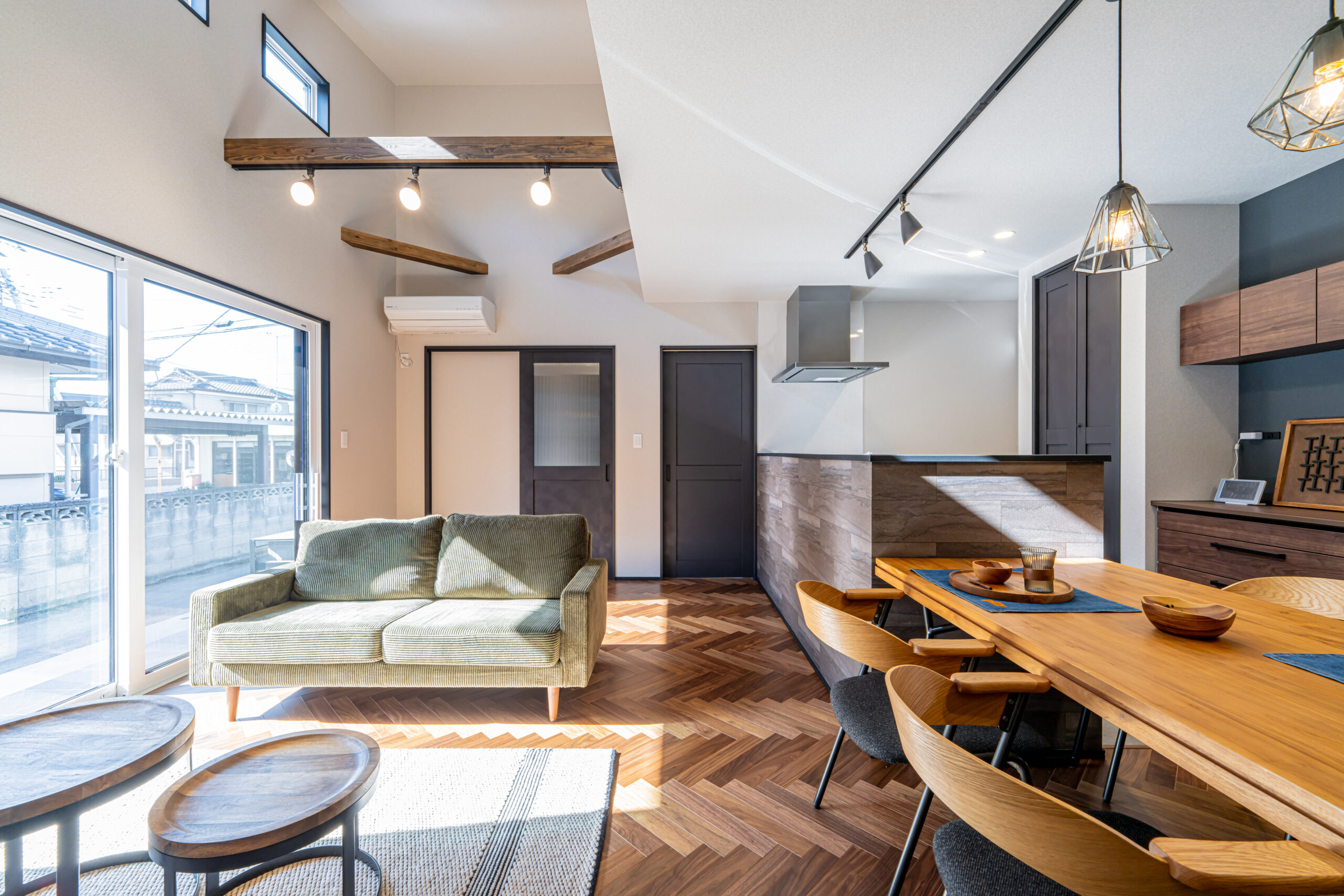 住まいの中心となるLDKは、勾配のある天井とあらわしの梁によって、平屋とは思えないほど伸びやかな空間に仕上げられている。